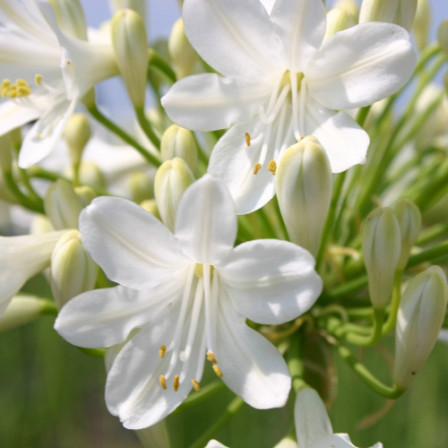De Agapanthus 'White Panthus' is een unieke, helderwitte variëteit die een prachtige, rijke bloei combineert met een sterke groeikracht. Door jaren van zorgvuldig kruisen en kweken hebben wij deze Agapanthus perfect aangepast aan de Nederlandse bodem, waardoor hij uitstekend groeit en bloeit in ons klimaat. Met zijn elegante, witte bloemen is de 'White Panthus' een echte blikvanger in elke tuin.